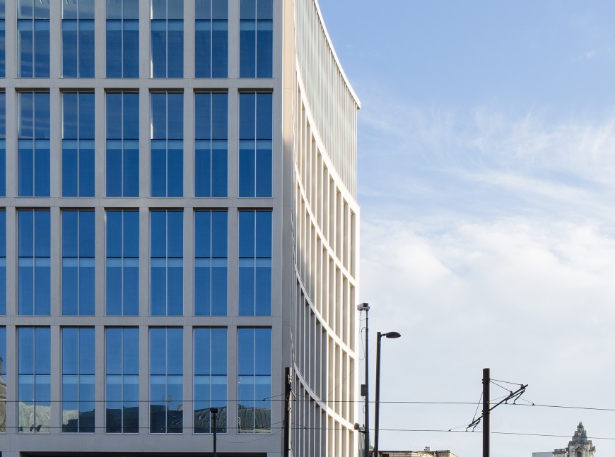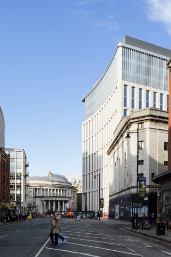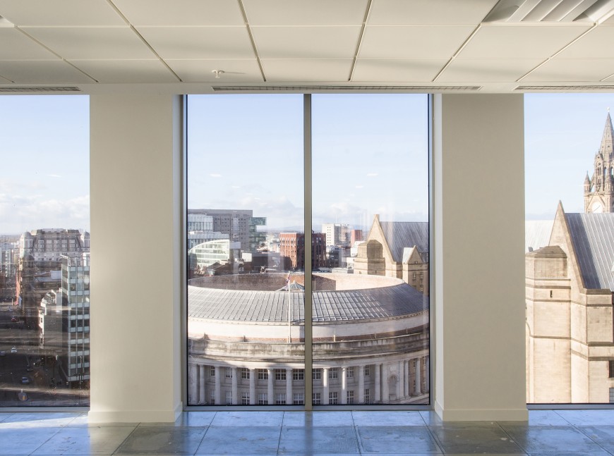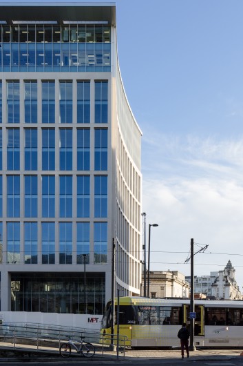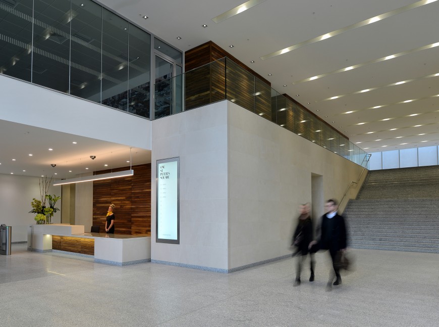 The building achieved a BREEAM ‘Excellent’ rating and contains retail space as well as Grade ‘A’ office space. The retail at ground floor along with a double height office reception which provides a cultural space for public exhibitions helps provide more activity at street level. The reception area is fully glazed providing uninterrupted views and connections across the revitalised public St Peter’s Square whilst still maintaining building security for its tenants.