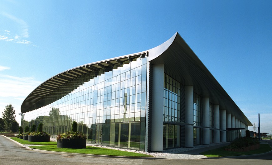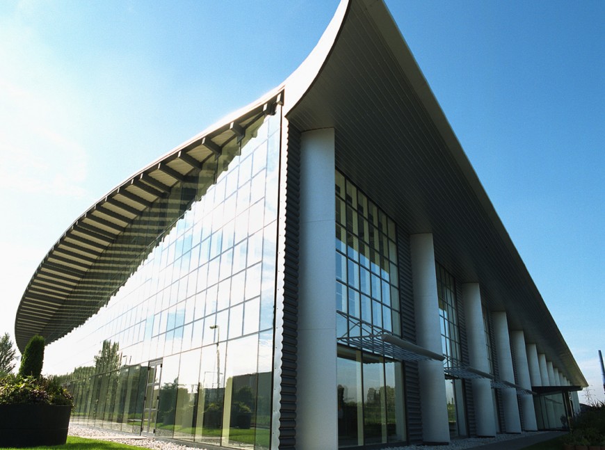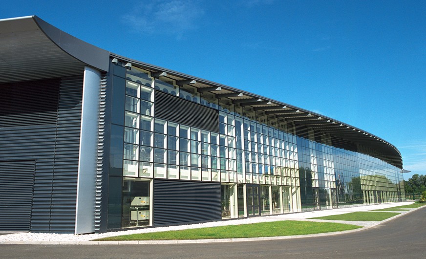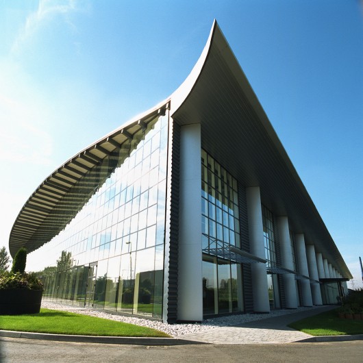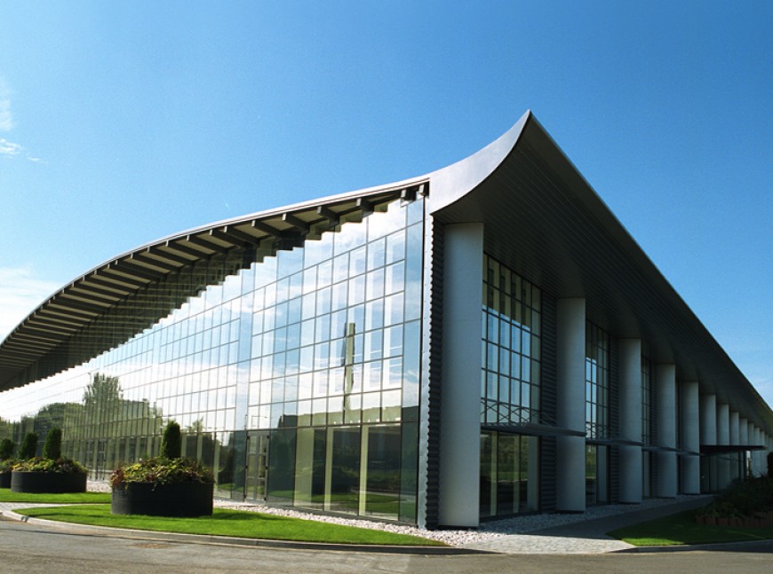 Total floor area for the first phase was 9072m² including 1375m² of fully integrated office space over two floors with production areas, laboratories and a specialist plant area. There are no physical barriers between office space and production area and total single status was achieved. The design of the building envelope and all of the services are carefully co-ordinated to speak one language. Materials were chosen that could conform to a design based on the disciplined application of a modular dimensional system which provided the image that Rolls Royce required and guaranteed consistency in detail.